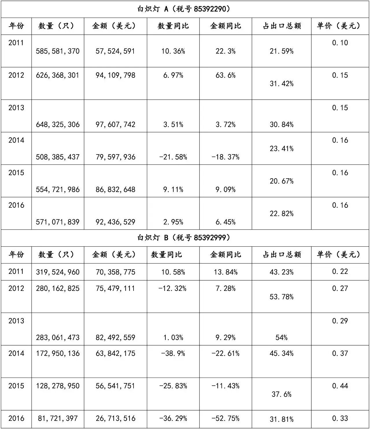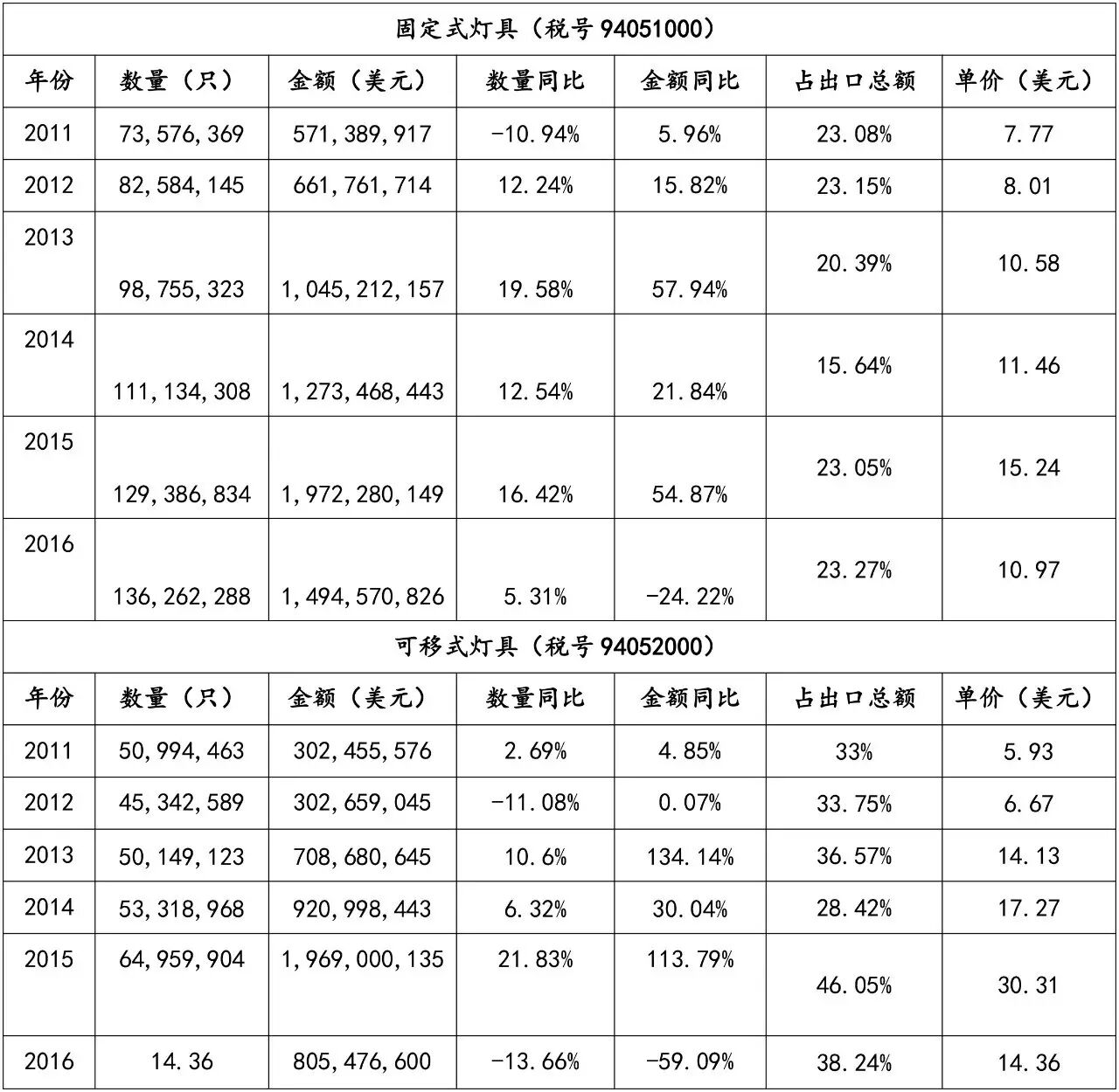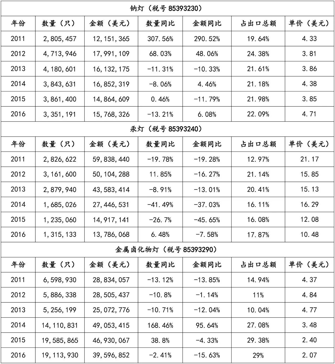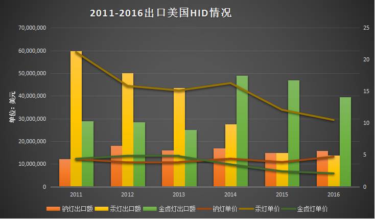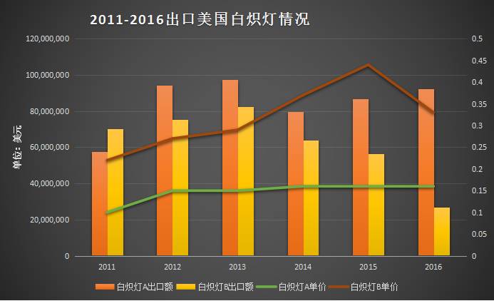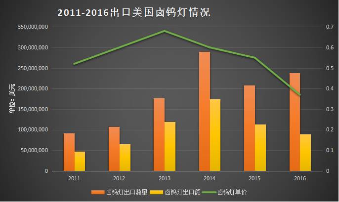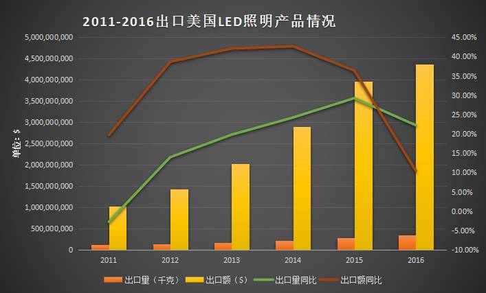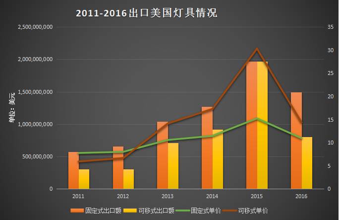 从图表中可知,出口到美国的 LED 照明产品近年来出口数量和金额增长势头均比较明显;但因增长基数过大导致增速放缓,此外还存在因产品寿命延长导致的市场峰值变换,伴随竞争惨烈的行业环境引起的产品单价下跌等问题。