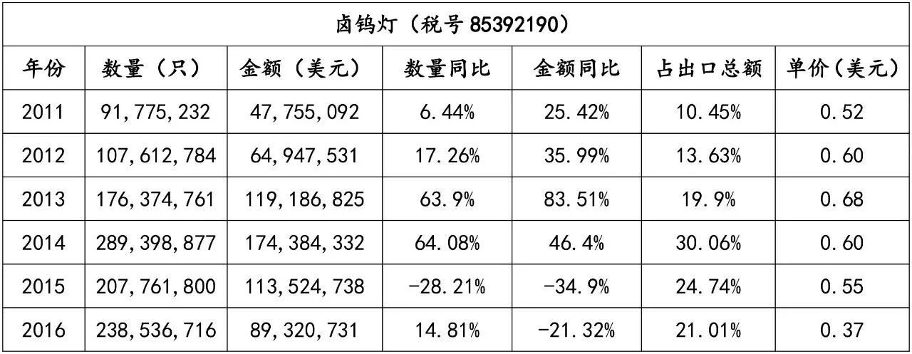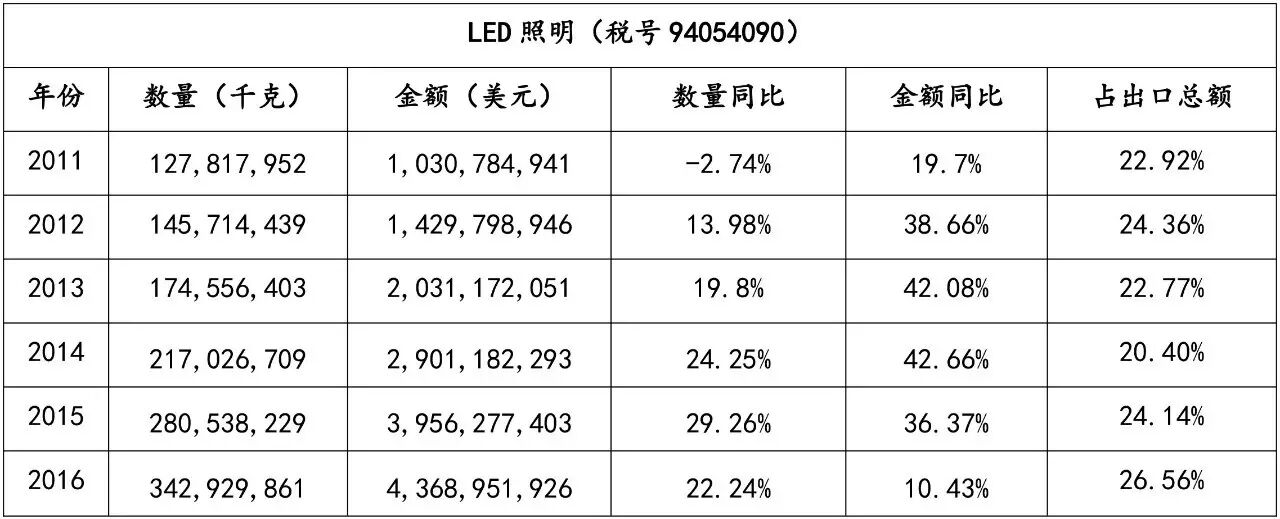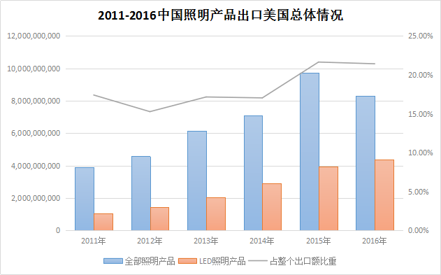 据笔者统计,除去 2016 年受整个经济形势低迷导致的照明产品出口下滑的影响,我国照明产品对美国出口额一直维持较高增速,2015 年一度接近 100 亿美元大关,占总出口额比重也呈上升趋势,俞发彰显其作为头号出口目的国的重要地位;LED 照明产品保持增长,只是增幅趋缓。