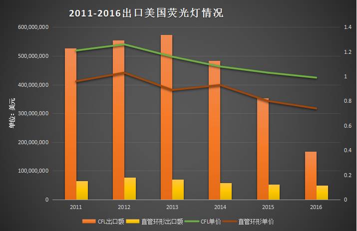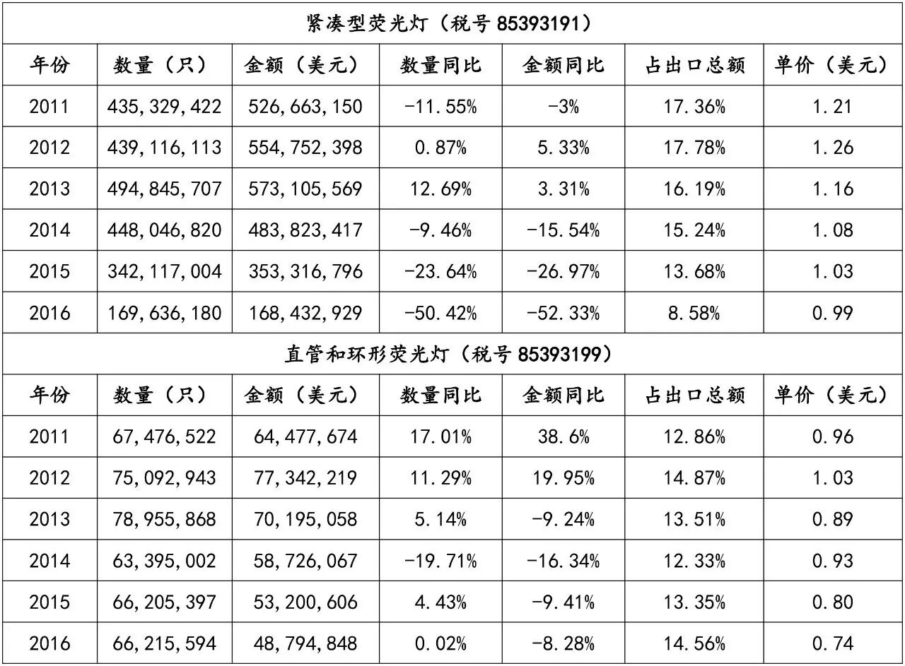 荧光灯类产品中,无论是紧凑型荧光灯还是直管和环形荧光灯,因性价比快速提升的LED照明产品的逐步替代而进入明显下行区间,量价齐跌。