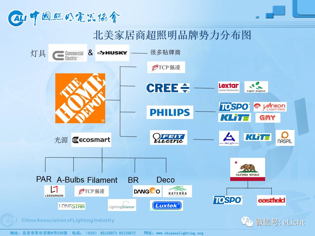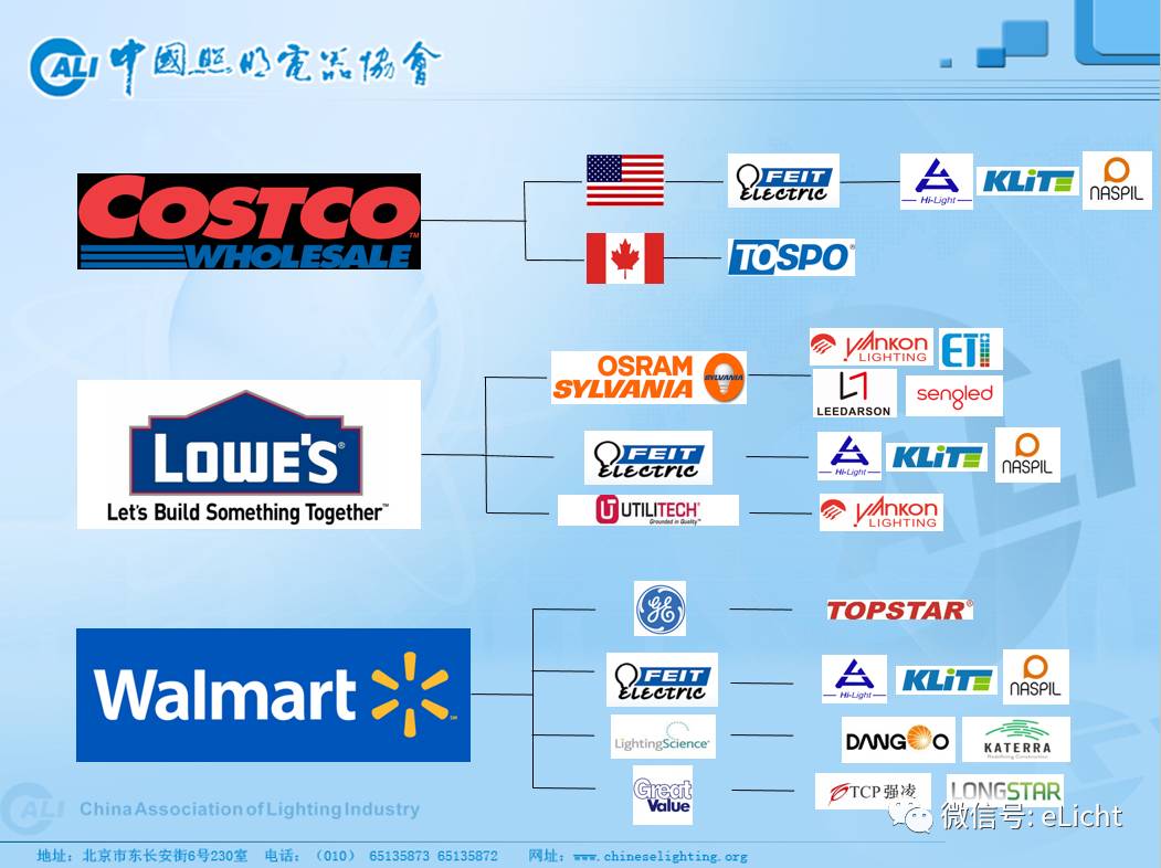 谈及美国照明市场,一个重点流通渠道就是家居商超,其中家得宝(Home Depot)、好事多(Costco)、罗氏(Lowe’s)位列三甲,各大国际品牌在其中均盘踞了势力范围。而各大贴牌厂商间的你来我往、此消彼长的惨烈竞争背后,实际上是国际品牌间针对市场的角力博弈。