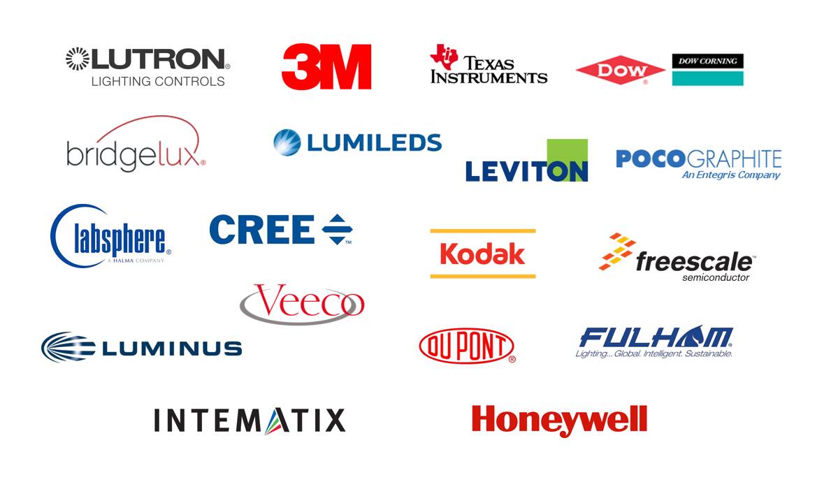 照明光电检测设备厂商蓝菲光学 Labsphere 闻名遐迩;著名半导体公司飞思卡尔Freescale(2015 年并入NXP);五大石墨盘厂商之一的步高(POCO Graphite);互联工业巨头霍尼韦尔 Honeywell 的楼宇自动化和电工产品;杜邦化学 DuPont 的散热基材;道康宁 Dow Corning(由陶氏化学Dow和康宁Corning合资)的有机硅导热胶;3M 公司的反射膜、粘合剂和电材;富桦明 Fulham 和德州仪器TI的 LED 驱动电源;路创 Lutron 和立维腾 Leviton 的调光控制系统;英特美 Intematix 的荧光粉等都享誉全球照明行业。