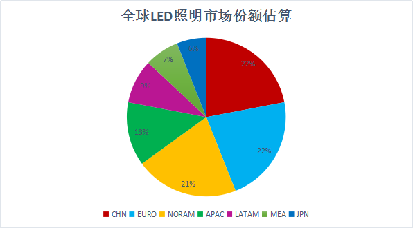 全球 LED 照明市场份额来看,中美欧三大市场三足鼎立,但中国市场为内销范畴,打法不同;欧洲市场看似统一,却又相对独立;只有美国是单一的超级市场,长期独霸我国各个照明品类出口目的国的头号宝座,所以谈论照明外销,可谓“得北美者得天下”。