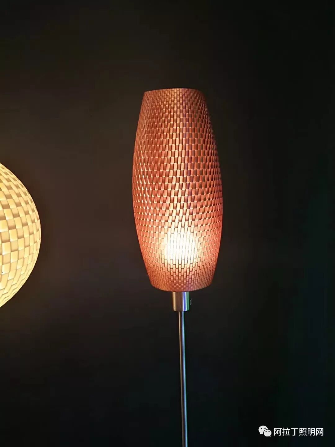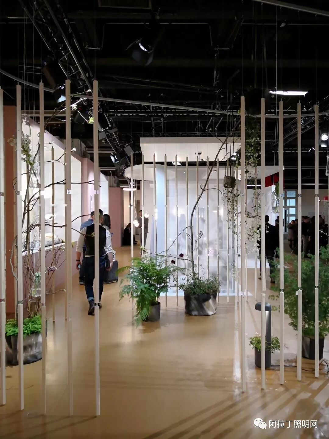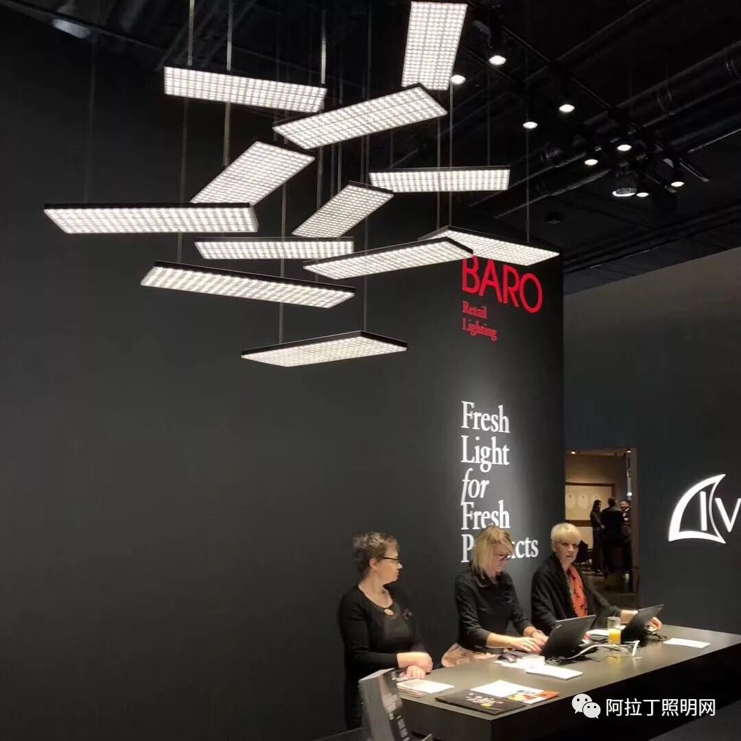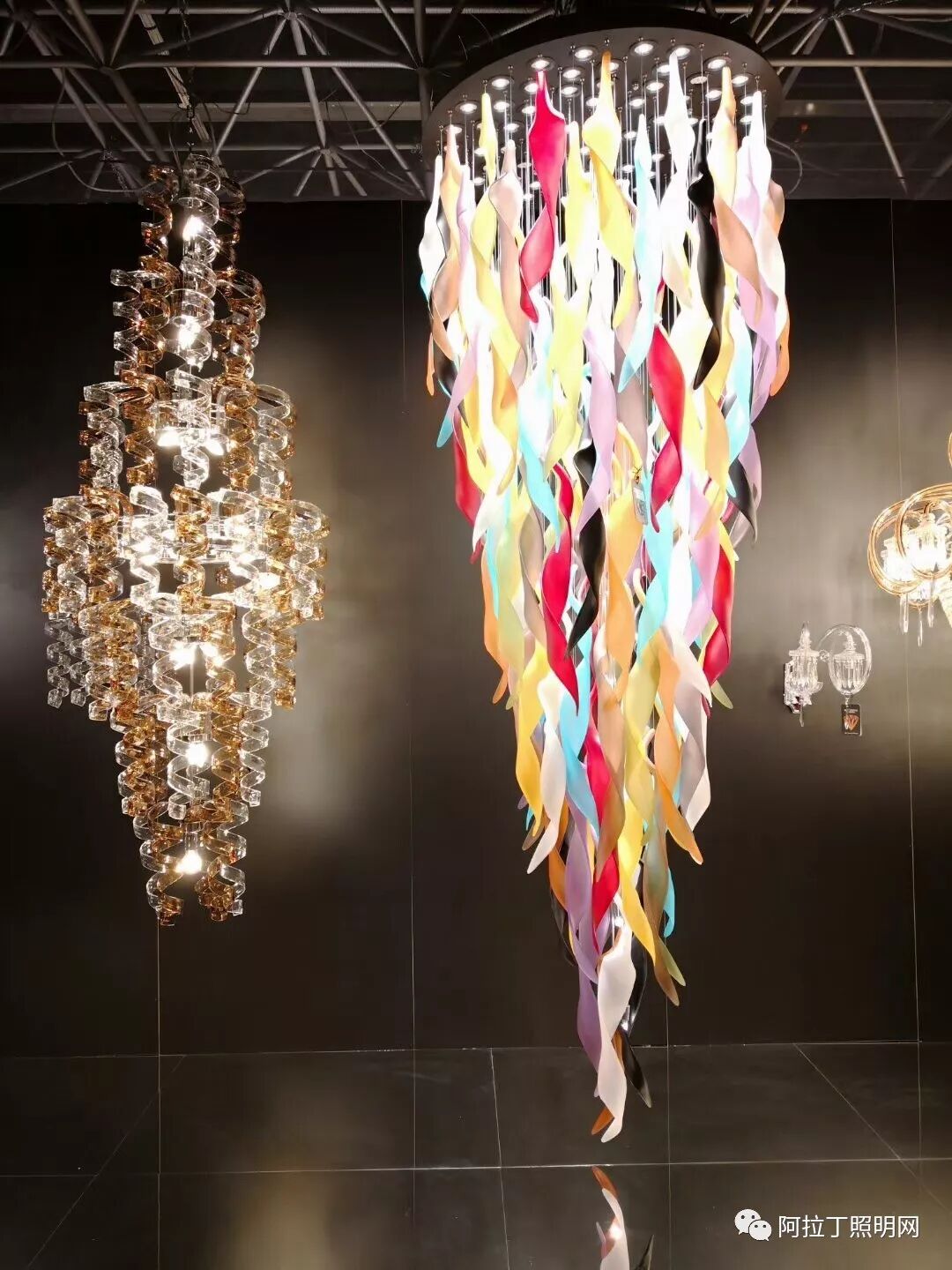 法兰克福,1号品牌馆的两组灯饰:一、把光纤维创意为生活化、三维化、应用化,改变了以往的新鲜面孔;二、铝线条的灯饰通过增加辅助的纤维麻料与铝材结合,呈现出线条的流畅感,在LED光源与软料布的结合,产生出二维与三维的碰撞效果,让灯在光亮中既有通透、还感觉到体量!